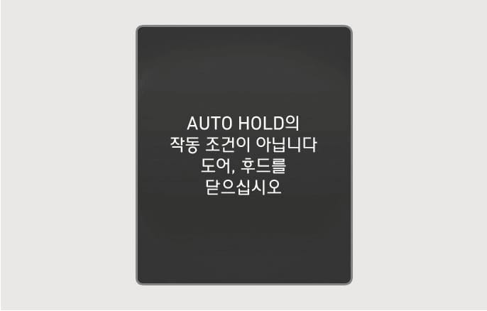 자동 정차 기능을 사용하기 위해 AUTO HOLD 버튼을 누를 때 운전석 도어나 후드가 열려 있으면 이 경고문이 표시되고 경고음이 울립니다. 운전석 도어와 후드를 모두 닫은 후 브레이크 페달을 밟은 상태에서 AUTO HOLD 버튼을 누르십시오.