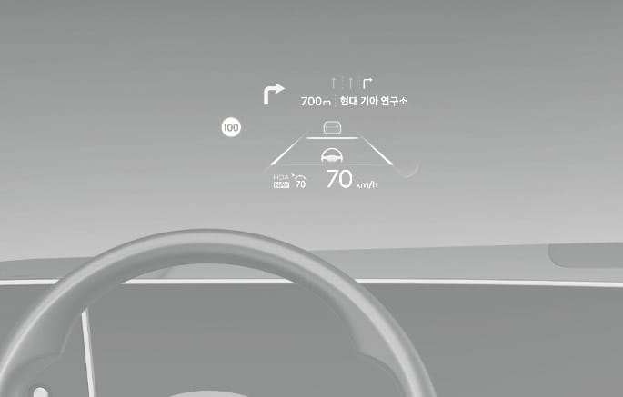 운전자 전면 유리에 클러스터 및 내비게이션 시스템의 주요 정보를 표시하여 운전자의 시선을 분산시키지 않고 정보를 제공하는 편의장치입니다.