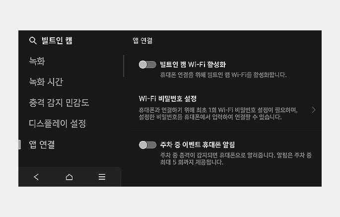 휴대폰 앱 연결을 위한 Wi-Fi 를 활성화 하거나, Wi-Fi 비밀번호를 설정할 수 있습니다.