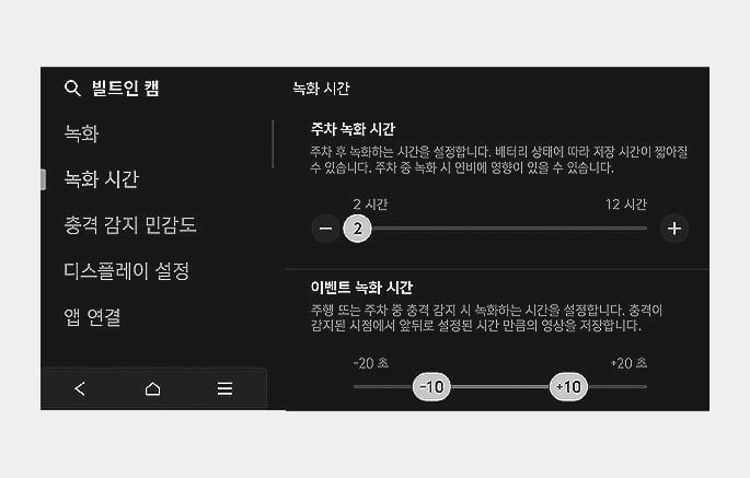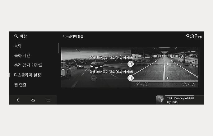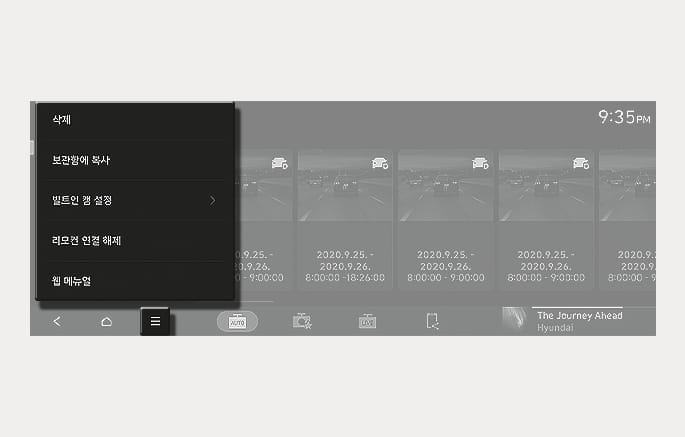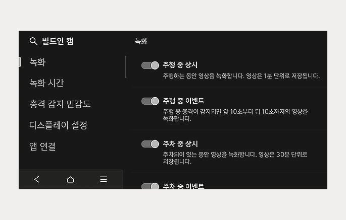 인포테인먼트 시스템 홈 화면에서 빌트인 캠을 선택한 후, 빌트인 캠 설정 메뉴를 선택하십시오. 빌트인 캠 녹화를 포함하여 작동과 관련된 다양한 항목을 설정할 수 있습니다.