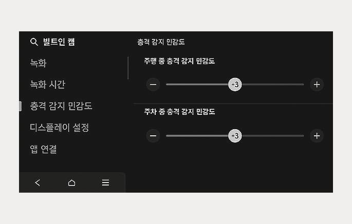 주행 및 주차 중 이벤트 녹화 여부의 기준이 되는 충격 감지 민감도를 선택할 수 있습니다. 1단계(매우 둔감), 2단계(둔감), 3단계(보통), 4단계(민감), 5단계(매우 민감) 중에 원하는 감지 조건을 선택하십시오.