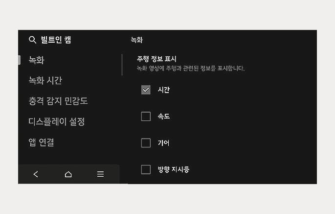 빌트인 캠 영상에 다양한 주행 정보를 기록할 수 있으며, 주행 정보 표시 메뉴에서 원하는 항목을 선택할 수 있습니다.