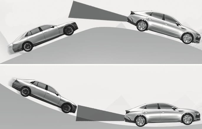 오르막길이나 내리막길에서는 옆 차로에 있는 차량을 인식하지 못해 후측방 충돌방지 보조가 정상적으로 작동하지 않을 수 있습니다.