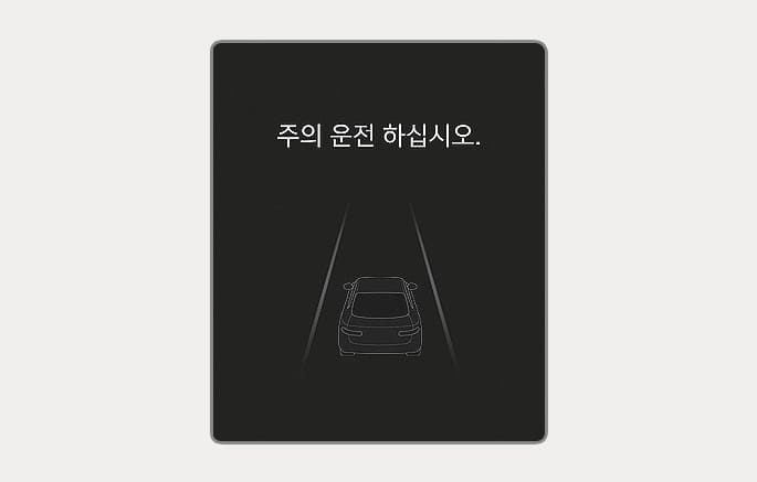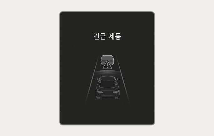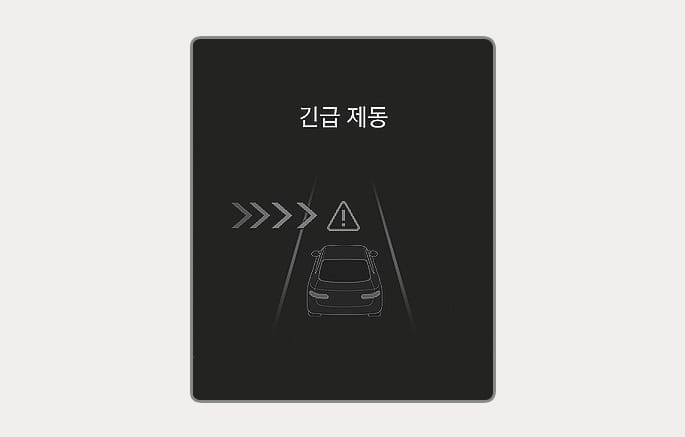 긴급 제동에 의한 정차 시 클러스터 등에 경고문이 표시됩니다. 안전을 위해 즉시 브레이크 페달을 밟고, 주변 상황을 확인하십시오.