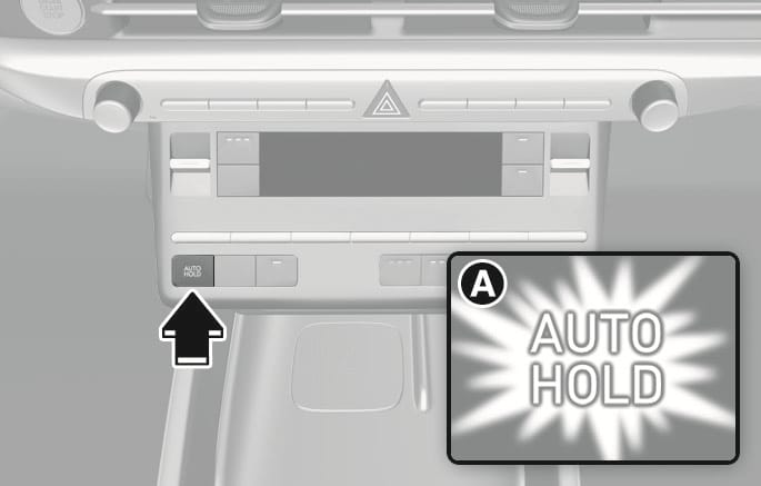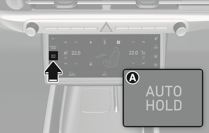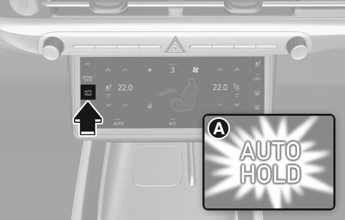 자동 정차 기능(Auto Hold)이 대기 또는 작동 중인 상태에서 시동 ‘OFF’ 후 재시동 시 자동 정차 기능(Auto Hold)은 작동 대기 상태를 유지합니다.