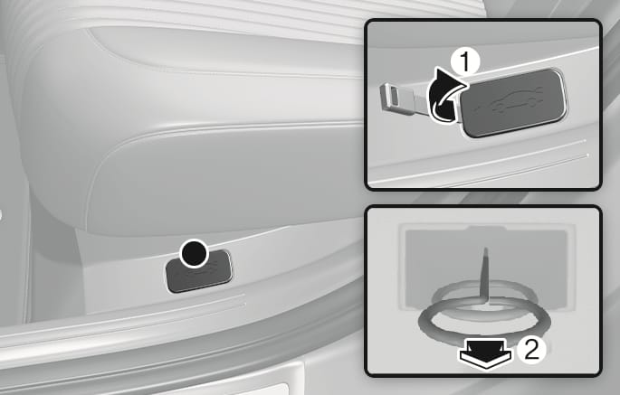 뒷좌석 시트 하단에 있는 케이블 커버(1)를 비상 키를 사용해 여십시오.