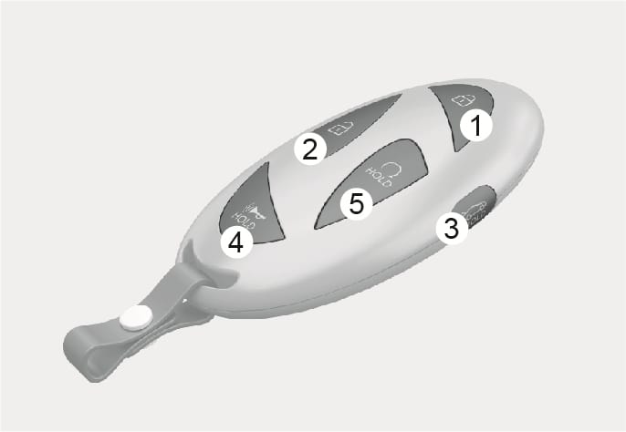 스마트 키의 트렁크 열림/닫힘 버튼(3)을 1초 이상 길게 누르십시오. 트렁크가 열리고, 비상 경고등이 2회 깜빡입니다.
