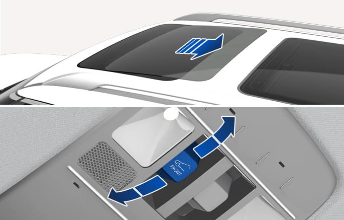 Push the sunroof switch rearward, the sunshade and sunroof glass slide open.