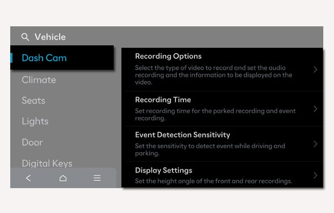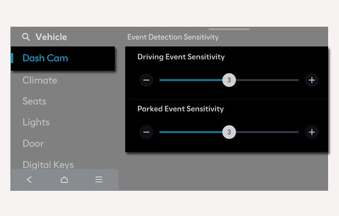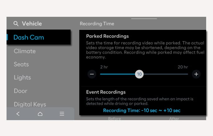 Changing drivers using the digital key or the infotainment system screen automatically changes the Dash Cam settings to fit the corresponding driver profile.