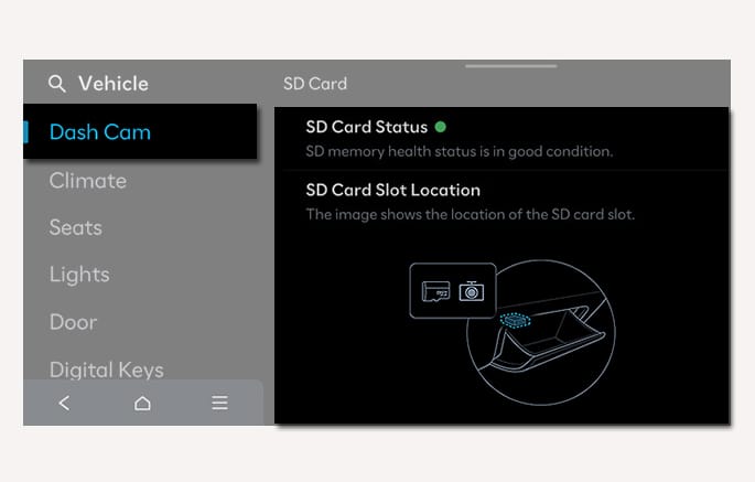 The Dash Cam may not work properly if you do not use a genuine SD memory card. Also, information on the SD memory’s lifespan may not be completely or accurately displayed.