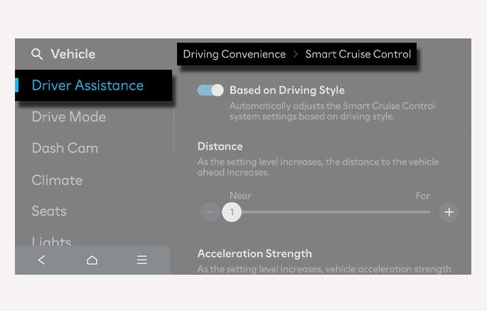 With the vehicle on, select Setup > Vehicle > Driver Assistance > Driving Convenience > Smart Cruise Control from the Settings menu in the infotainment system, you can change the vehicle distance, the acceleration, and the reaction speed manually.