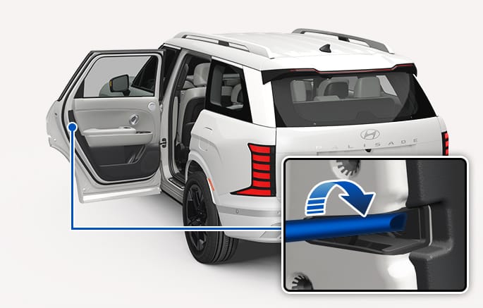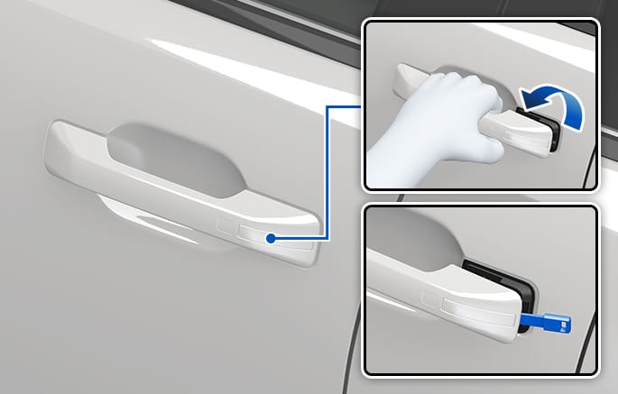 Insert a small blade tool (for example, screwdriver or similar) into the emergency door lock hole and turn it clockwise for left side door, or turn it counterclockwise for right side door.