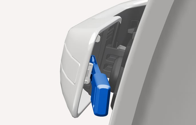 Pull the door handle and press the hook located inside the cover with a mechanical key. Carefully pull out the cover and expose the key cylinder.