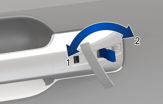 Insert the mechanical key into the key cylinder, and turn the key clockwise to unlock the vehicle (direction 2) or counterclockwise to lock the vehicle (direction 1).