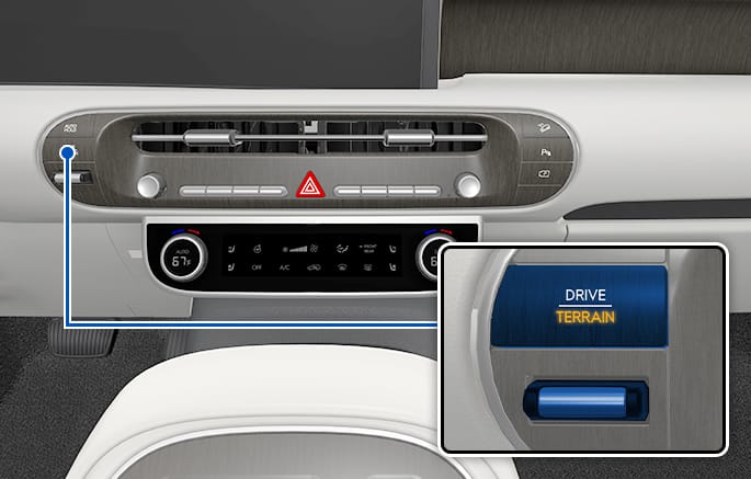 Press the DRIVE/TERRAIN button to change from normal driving mode to multi terrain mode. Press the button up or down to select SNOW, MUD, or SAND.