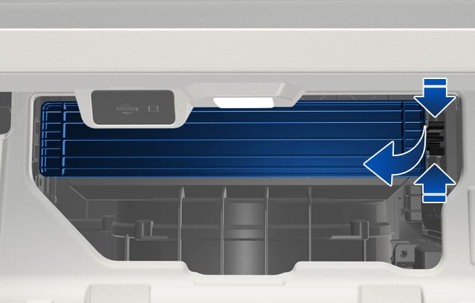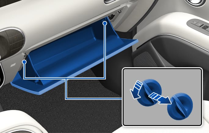 Push in both sides of the glove box to release the glove box stopper pins and allow the glove box to hang open.