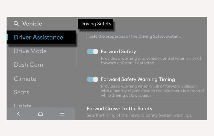When Forward Cross-Traffic Safety is selected, Junction Crossing function operates. Forward Safety should be activated for Forward Cross-Traffic Safety to activate. (if equipped)