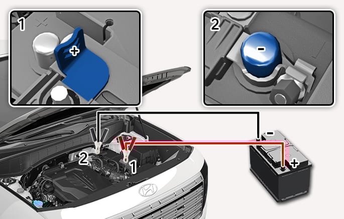 Do not connect the jumper cable to the negative - jumper terminal of the discharged battery. A spark could cause the battery to explode and lead to a personal injury or vehicle damage.
