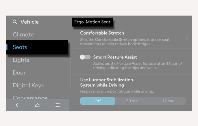 After driving for an hour, Smart Posture Assist automatically adjusts the pelvis and back portion of the seat to assist the posture.