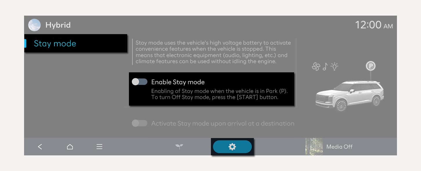 Ĵ (Hybrid) > Stay Mode, and press Enable Stay Mode to turn on the mode.Instead of pressing 'Enable Stay Mode', you can turn on the stay mode by enabling 'Activate Stay Mode Upon Arrival at a Set Destination’. Shift the gear to P (Park) upon arrival at the destination, and a confirmation message pops up asking if you want to start stay mode. Press 'Yes’ to turn on the mode.