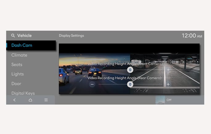 An alternative way to access the Dash Cam settings menu is to select Setup > Vehicle > Dash Cam from the infotainment system screen. You can configure settings for recording and other items related to the Dash Cam operation.