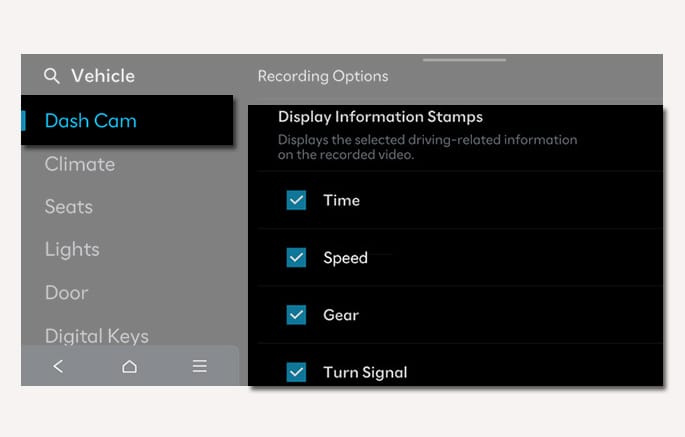 You can record various driving information in the Dash Cam's video, and select the desired items on the Display Information Stamps menu.