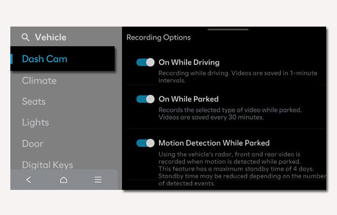 Changing drivers using the digital key or the infotainment system screen automatically changes the Dash Cam settings to fit the corresponding driver profile.