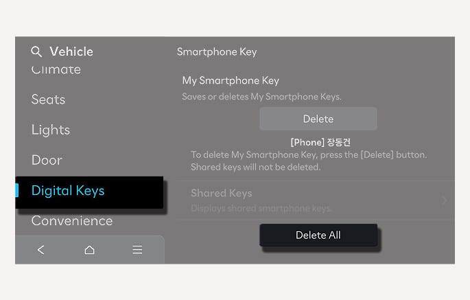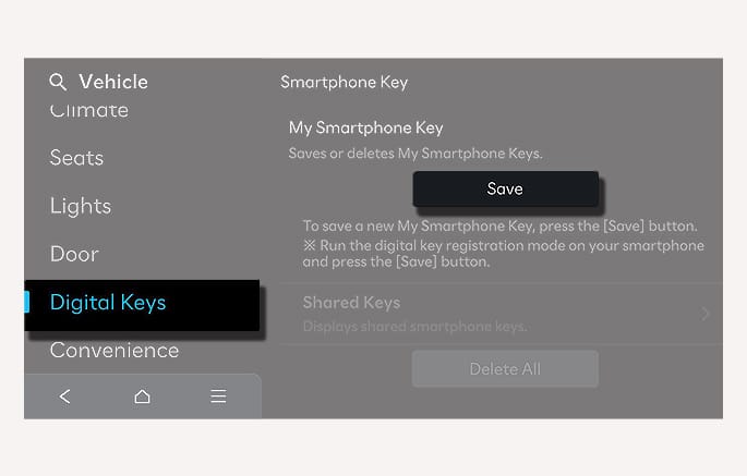 To delete all the registered digital key (smartphone), select Setup > Vehicle > Digital Keys > Smartphone Key > Delete All from the infotainment system.