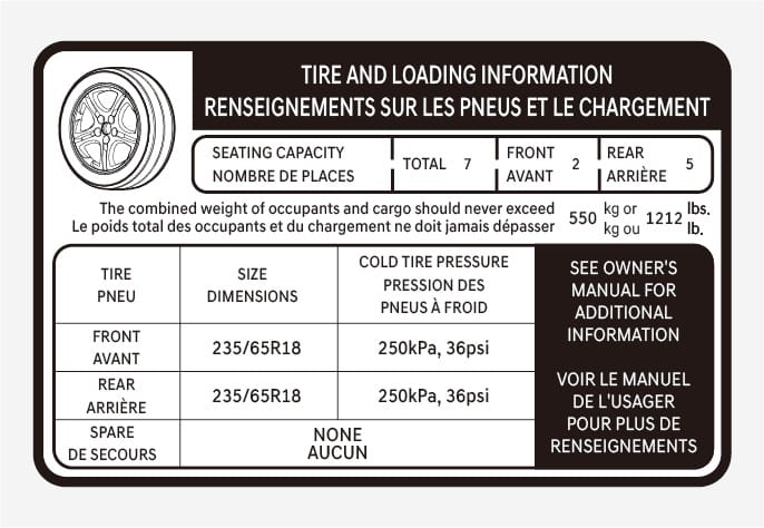 The label located on the driver's door jamb shows the original tire size, cold tire pressures recommended for your vehicle, the number of people that can be in your vehicle and vehicle capacity weight.