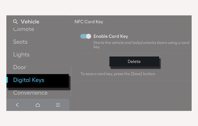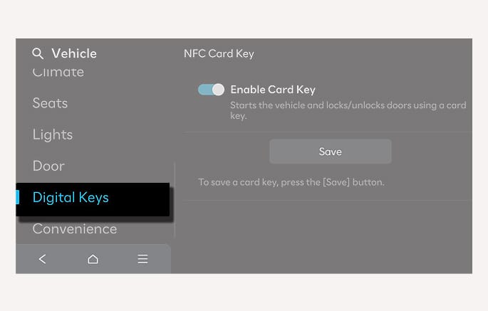 Select Setup > Vehicle > Digital Keys > NFC Card Key, and check whether Enable Card Key is selected in the infotainment system.