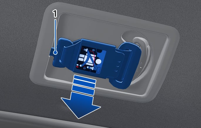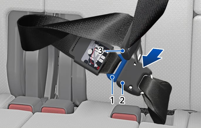 To retract the rear center seatbelt, insert the tongue (3) plate into the web release hole (2). Pull up on the seat belt web and allow the webbing to retract automatically. Insert the tongue plate (1) into the hole on the belt assembly cover.