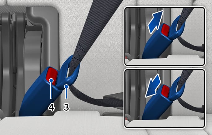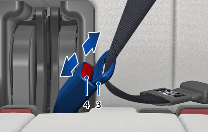Pull out the tongue plate (3) from the pocket. Pull the tongue plate (3) and insert it into the buckle (4) until an audible “click” is heard, indicating the latch is locked. Make sure the belt is not twisted.