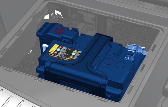 The 12 V lithium auxiliary battery, which is integrated with the high voltage battery, is installed in the vehicle to supply power to lamps, wipers, and audio system.