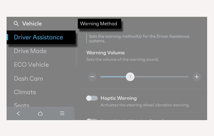 Lane Safety Warning Sound: You can turn on or off the Lane Safety Warning Sound when the Haptic Warning is on.