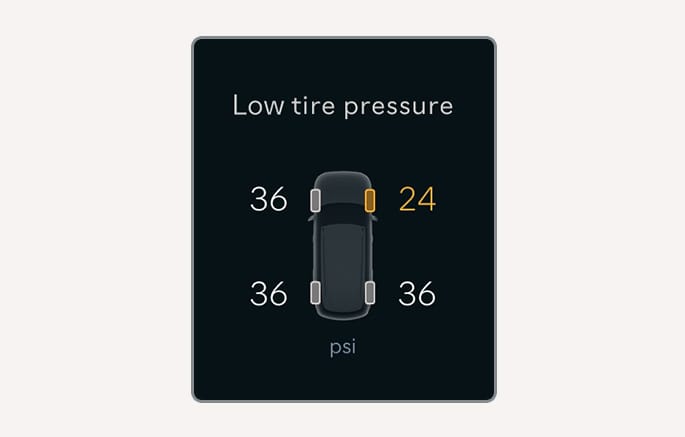 When the tire pressure monitoring system warning indicators illuminate and a warning message appears on the cluster display, one or more of your tires are significantly under-inflated. The Low Tire Pressure Position Telltale indicates which tire is significantly under-inflated by illuminating the corresponding parking light. If either telltale illuminates, immediately reduce the vehicle speed, avoid hard cornering and anticipate increased stopping distances. Stop and check your tires as soon as possible. Inflate the tires to the proper pressure as indicated on the vehicle's placard or tire inflation pressure label located on the driver's side center pillar outer panel.