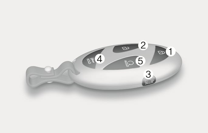4초 이내에 원격 시동 버튼(5)을 2초 이상 누르십시오. 시동이 걸리고, 비상 경고등이 깜빡입니다.