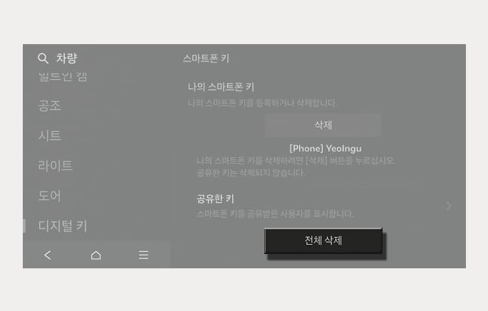 등록된 디지털 키(스마트폰)가 없으면 전체 삭제 항목을 선택할 수 없습니다.