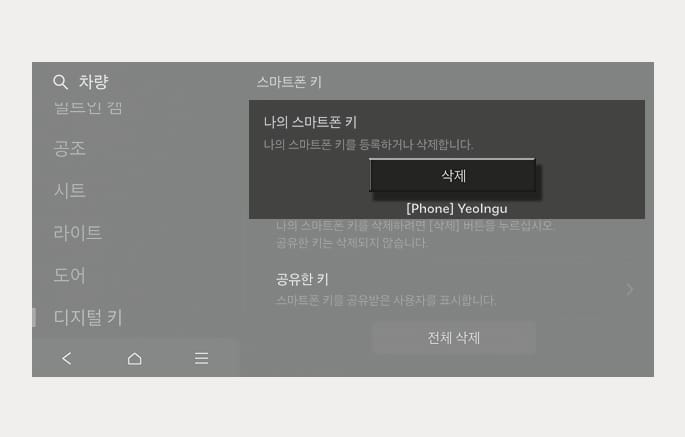 스마트폰에서 디지털 키를 삭제하는 경우 차량에 등록된 디지털 키(스마트폰)도 삭제됩니다.