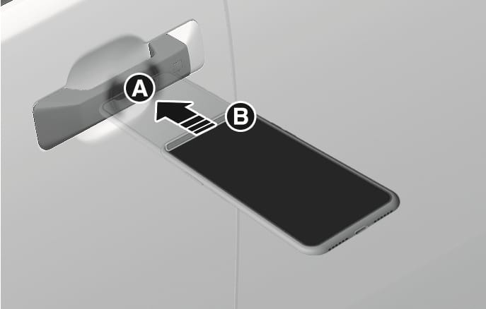 스마트폰을 차량 도어 손잡이에 터치하여 도어 잠금/잠금 해제가 가능하며, 차량 내 실내 인증 패드(무선 충전 패드)[A] 위에 올려놓고 시동을 걸 수 있습니다.