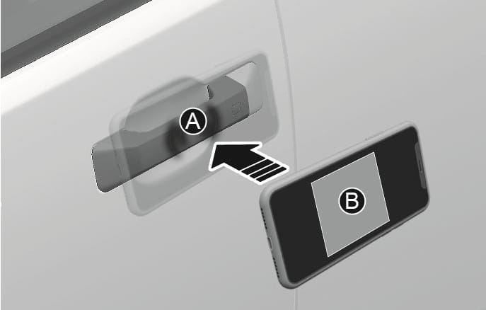스마트폰을 휴대하고 있으면 스마트폰을 도어 손잡이에 터치하지 않고, 도어 손잡이에 있는 도어 잠금/해제 센서부(음각)를 터치하여 도어 잠금/잠금 해제가 가능합니다. 또한, 실내 인증 패드(무선 충전 패드)[A]에 스마트폰을 두지 않아도 시동 버튼으로 시동을 걸 수 있습니다.