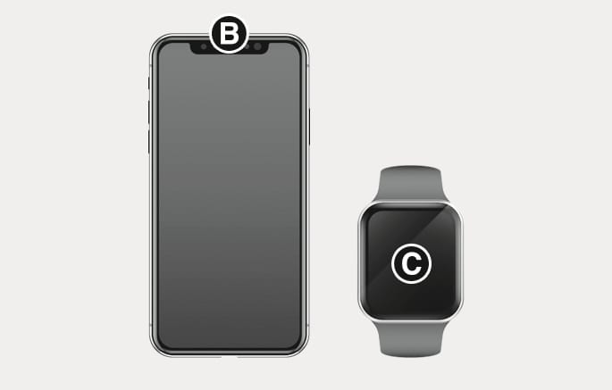 Apple iphone의 NFC 안테나는 기기 후면 최상단[B], Apple WATCH의 NFC 안테나는 화면 중앙[C]에 위치합니다.