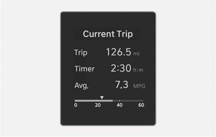 The trip computer mode displays information related to vehicle driving parameters including fuel economy, tripmeter information, and vehicle speed.