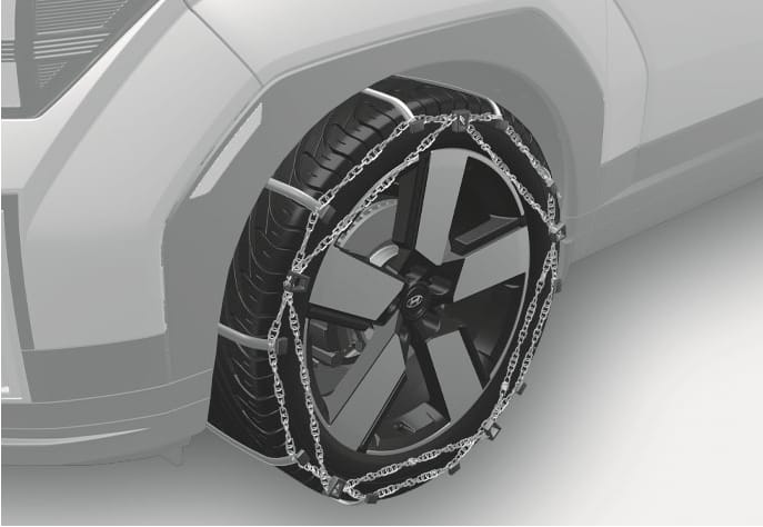 instead of tire chains. If tire chains must be used, use genuine HYUNDAI Parts and install the tire chains after reviewing the instructions provided with the tire chains. Damage to your vehicle caused by improper tire chain use is not covered by your vehicle manufacturer’s warranty.