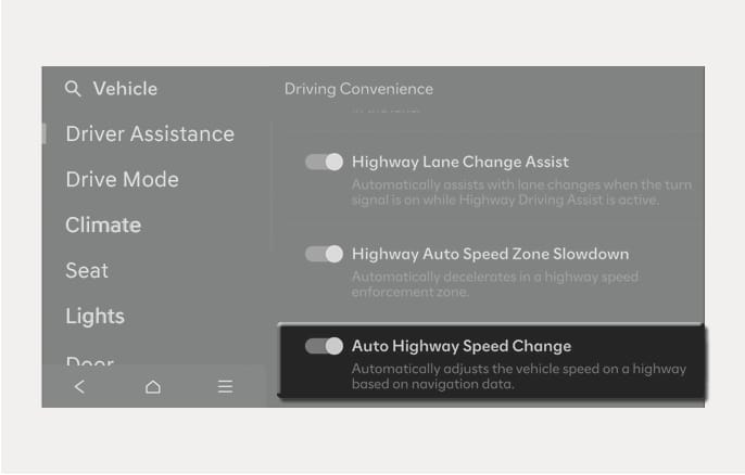With the engine on, select Setup > Vehicle > Driver Assistance > Driving Convenience > Highway Auto Speed Change from the infotainment system to turn on Navigation based Smart Cruise Control and deselect to turn off the function.