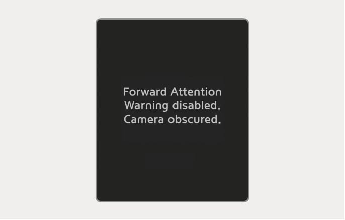 When there is an object right in front of the in-cabin camera or between the driver and the camera for a certain period of time, Forward Attention Warning does not operate properly, and the "Forward Attention Warning disabled. Camera obscured" warning message appears on the instrument cluster, and an audible warning sounds.