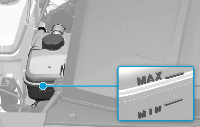 Der Kühlmittelfüllstand sollte zwischen den Markierungen MAX und MIN an der Seite des Kühlmittelbehälters liegen, wenn der Motor kalt ist.