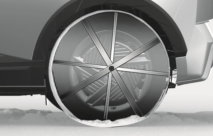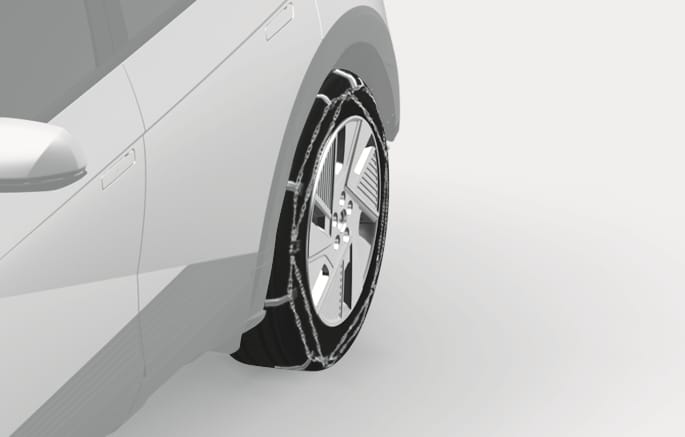 Da die Seitenwände von Radialreifen dünner sind als bei anderen Reifentypen, können sie beschädigt werden, wenn bestimmte Schneeketten darauf montiert werden. Deshalb empfehlen wir die Verwendung von Winterreifen anstelle von Schneeketten. Wenn Schneeketten verwendet werden müssen, verwenden Sie Original-Hyundai-Teile, und montieren Sie die Schneekette, nachdem Sie die Anweisungen für Schneeketten gelesen haben. Fahrzeugschäden durch unsachgemäße Montage von Schneeketten unterliegen nicht der Fahrzeuggarantie des Herstellers.