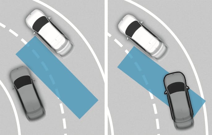 Der Totwinkel-Kollisionsvermeidungsassistent funktioniert nicht ordnungsgemäß, wenn Sie auf einer kurvigen Straße fahren. Das System kann ein Fahrzeug in der gleichen Fahrspur erkennen.