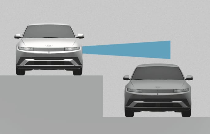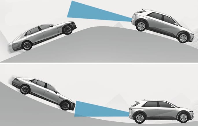 Der Totwinkel-Kollisionsvermeidungsassistent funktioniert möglicherweise nicht ordnungsgemäß, wenn Sie an einer Steigung fahren. Das System kann das Fahrzeug in der benachbarten Fahrspur möglicherweise nicht oder den Boden oder die Konstruktion falsch erkennen. Achten Sie während der Fahrt immer auf die Straßen- und Fahrbedingungen.