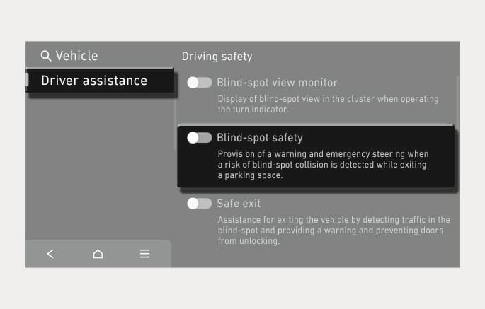 Wählen Sie bei eingeschaltetem Fahrzeug im Infotainmentsystem Einstellungen > Fahrzeug > Fahrerassistenz > Fahrsicherheit > Sicherheit toter Winkel oder heben Sie die Auswahl auf, um festzulegen, ob die einzelnen Funktionen verwendet werden sollen.
